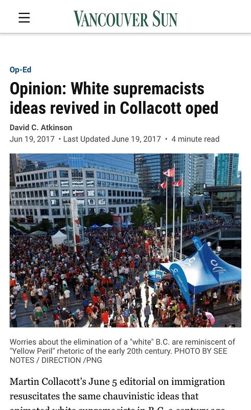 “White Supremacist Ideas Revived in Collacott Op-ed,” Op-ed, Vancouver Sun